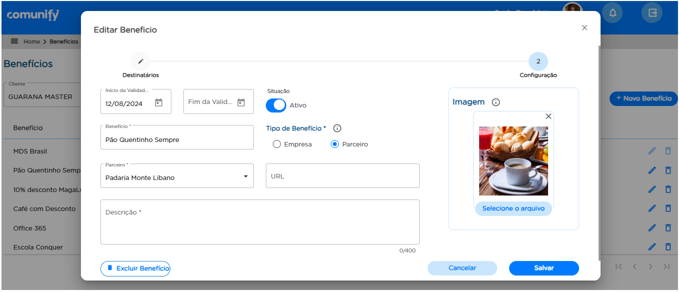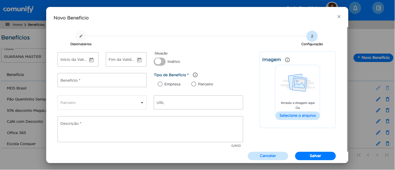 Parceiro: O usuário cliente deverá selecionar um Parceiro para relacionar ao benefício, quando for do tipo “Parceiro”.