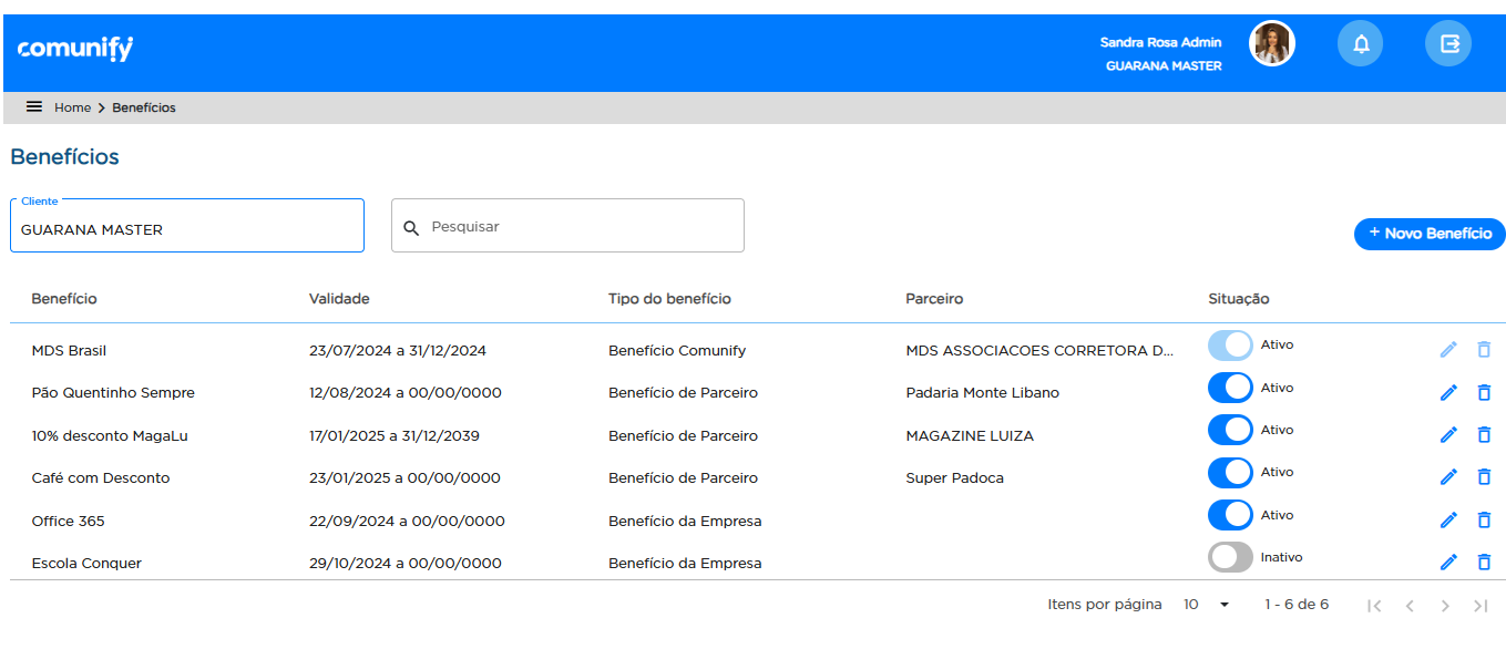 Em Benefícios, o usuário cliente poderá visualizar, cadastrar, ativar/inativar, editar ou excluir um benefício. Os benefícios podem ser serviços, produtos ou descontos fornecidos pelos parceiros da empresa do usuário cliente.
