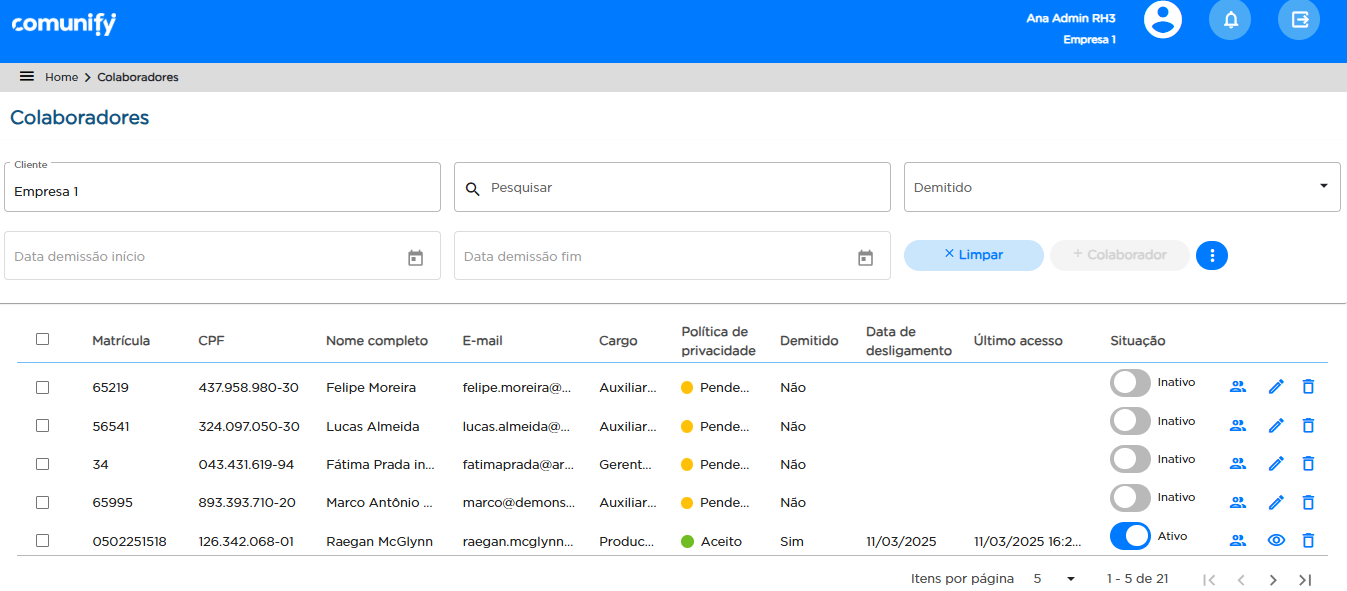 Na tela, é necessário selecionar um cliente para exibir todos os colaboradores cadastrados listados com a opção de paginação (opção de exibição de 5-10-25-100 registros por página).