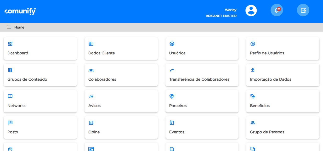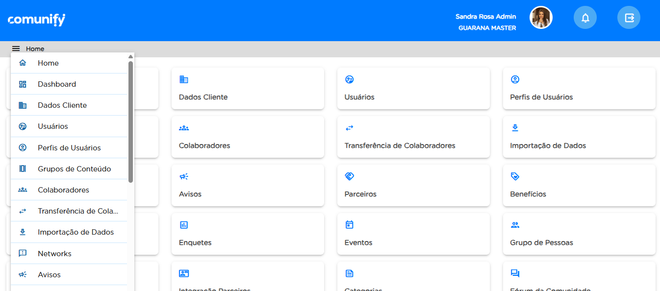 Na página inicial, também conhecida como "Home", o usuário cliente tem uma visão geral e acesso rápido às funcionalidades oferecidas pela plataforma. O menu, inclui a mesma lista de funcionalidades, organizada de forma lógica para facilitar a navegação.
