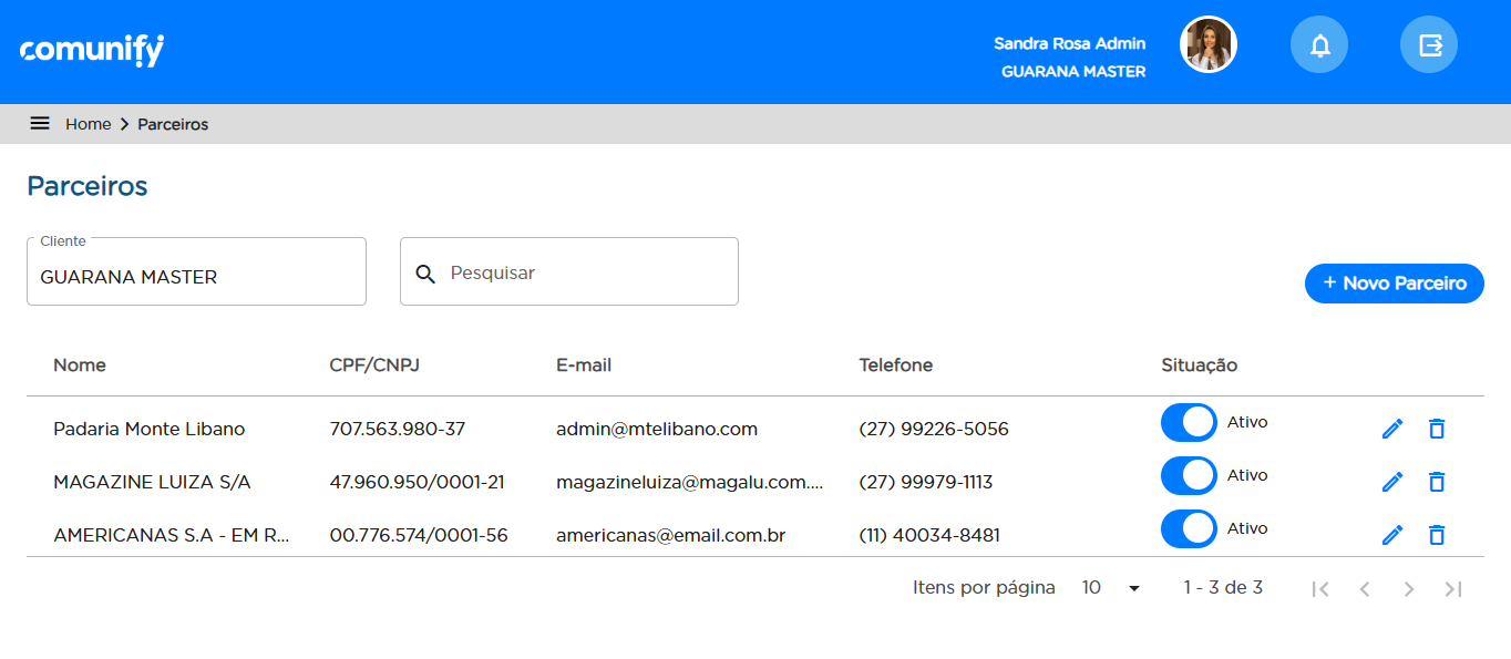 Na tela, serão exibidos todos os parceiros cadastrados listados com a opção de paginação (opção de exibição de 5-10-25-100 registros por página).