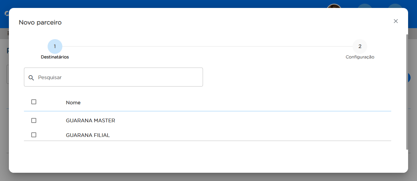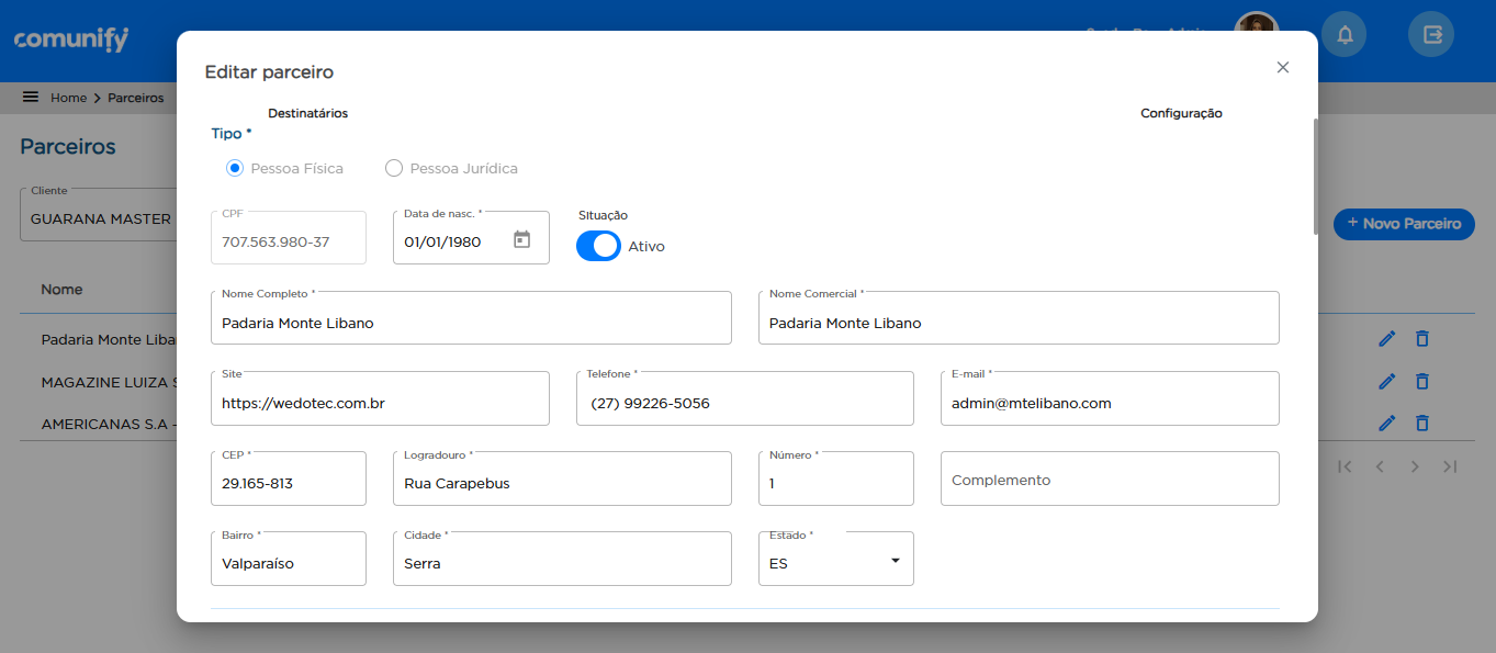 Destinatário: Informar a qual cliente pertencerá ao parceiro.