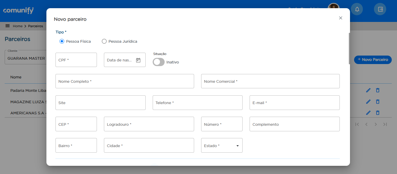 Os campos serão adaptados automaticamente dependendo do tipo de parceiro selecionado, se pessoa física ou jurídica.
